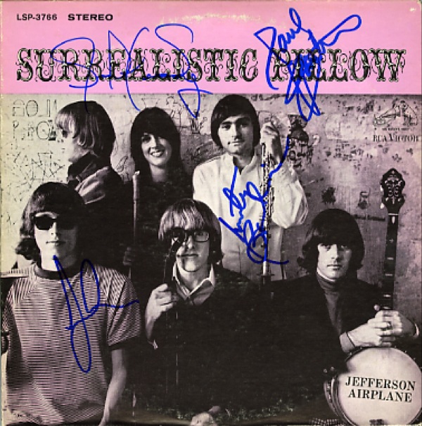 Surrealistic Pillow album signed on the front in blue felt tip by Jorma Kaukonen, Jack Casady, Paul Kantner, and Marty Balin. In very good condition, with moderate age wear. The record is included. R&R COA.