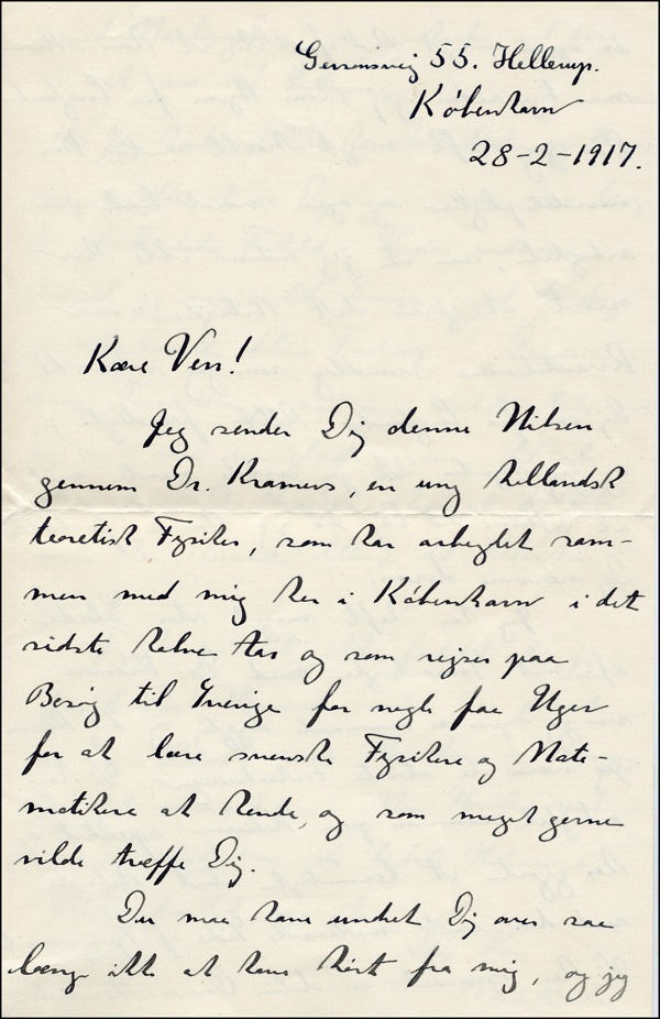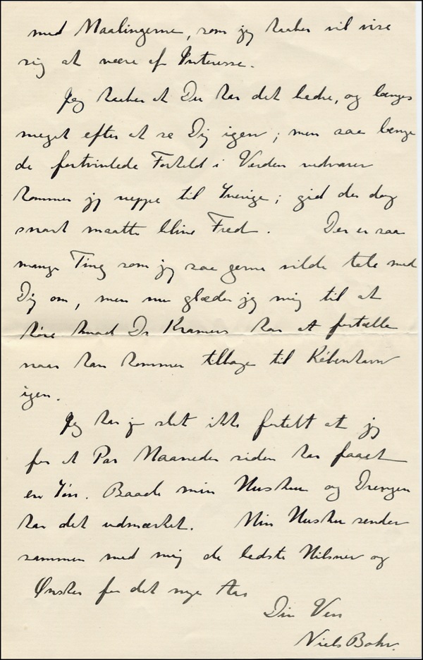 Danish physicist awarded the Nobel prize for Physics in 1922 for his theory of atomic structure. ALS in Danish, three pages on two adjoining sheets, 5 x 8, Copenhagen letterhead, February 28, 1917. Lengthy letter to a friend (probably male, perhaps a colleague), translated in part: “I send you this greeting through Dr. H.A. Kramers, Dutch physicist...who is traveling on Bexx to Sweden...to teach Swedish physicists and mathematicians to...and who very much wishes to meet you. You may have been wondering why you’ve not heard from me, and I have had so many things...Since I came back from England had some hard work with my university duties, so my work with the Quantum Theory Constitution (Basic Law) I wrote to you about from England isn’t completed, and I thought I shouldn’t write to you until I was able to tell you more about it. I have had very great joy from my teamwork with Dr. Kramers, who I think is competent...We have worked together and the Helium and spectra and have made a rather large work on the mechanical aspects of...We have accomplished a partial conformity with the measurements, which I believe will prove to be very interesting. I hope you will have a nice time and long to meet you again; but as long as the desperate...In the world...I will not go to Sweden...the day soon that brings Peace. There are so many things I will talk with you about, but now I will enjoy myself with what Dr. Kramers has to tell when he comes back to Copenhagen again. I have...not told you that a few months ago have had a son. Both my wife and son are well. My wife sends together with me the best wishes and...on the new year...” The Hendrick A. Kramers referred to in this letter was a Dutch physicist who won the Hughes Medal in 1951. A crater on the Moon is named after him. In fine condition. COA John Reznikoff/PSA/DNA and R&R COA.