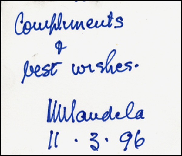 Felt tip signature, “Compliments & best wishes, N. Mandela,” on an off-white 3.25 x 3 card, dated November 3, 1996. In fine condition. R&R COA.