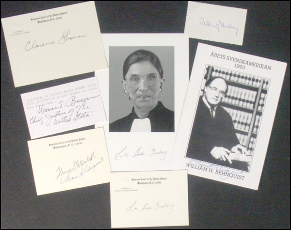 Lot of eight signatures of Supreme Court justices (the signatures are on Supreme Court cards, cards, book portraits, TLS, etc.,) including: Arthur J. Goldberg, Thurgood Marshall and William H. Rehnquist (on the same Supreme Court card); William H. Rehnquist; Ruth Bader Ginsberg (one signed book portrait, one signed Supreme Court card); Warren E. Burger (adding “Chief Just of the United States”); and, Clarence Thomas. In fine condition. R&R COA.