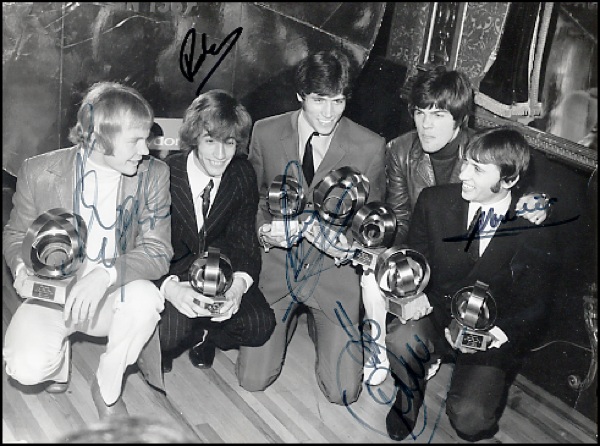 Glossy 9.25 x 7 photo of all five group members holding record awards, signed in black felt tip by Barry, Robin and Maurice Gibb, all first names only, and also signed by bandmates Colin Peterson and Vince Melouney. In fine condition, with a few corner creases and light curling to edges. COA Roger Epperson and R&R COA.