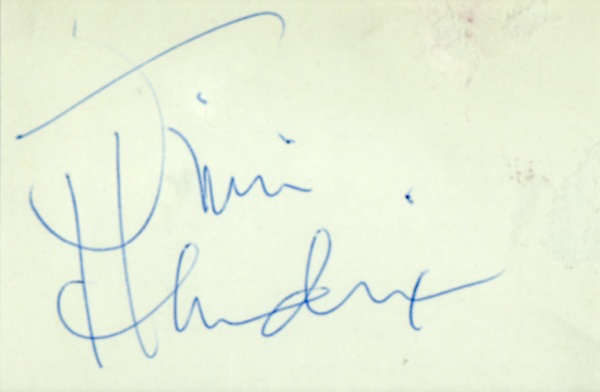 Ballpoint in-person signature on an off-white 4 x 3.5 card. Double-matted and framed, with an unsigned 12 x 9 photo of Hendrix on stage at Woodstock, an unsigned 6 x 2.5 three-day ticket for Woodstock, and three photos of members of the Electric Gypsies, each signed by the respective man pictured, to an overall size of 18 x 38. In fine condition, with areas of lsight discoloration. Oversized. COA Roger Epperson/PSA/DNA and R&R COA.