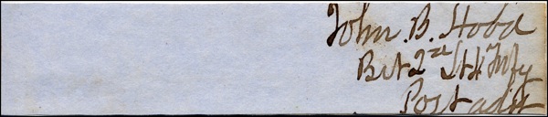 Confederate army officer; he graduated from West Point near the bottom of his class and served in California and Texas. Resigning to join the Confederate service, he commanded a brigade at 2nd Bull Run and Antietam and a division at Gettysburg, where he was seriously wounded. Ink signature, “John B. Hood,” on a light blue 4.25 x 1 slip, adding his rank and unit underneath. In fine condition, with a bit of scattered light toning and a closely trimmed top edge. R&R COA.