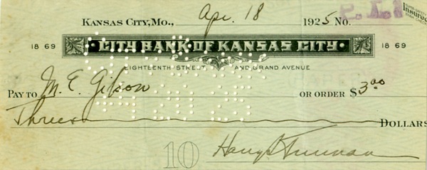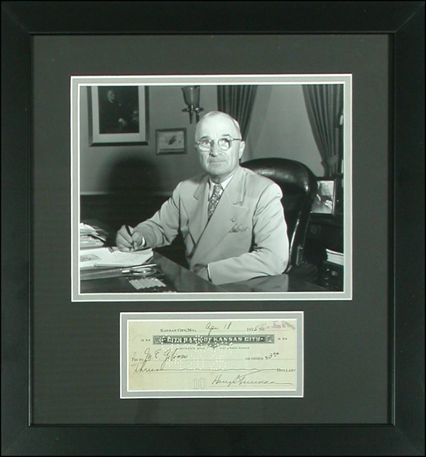 Check, 6 x 2.75, filled out in another hand and signed by Truman, payable to M. E. Gibson for $3.00, April 18, 1925. Double matted and framed with a nice portrait of Truman, to an overall size of 15.5 x 16.5. In fine condition, with cancellation holes and stamps to body, none affecting clean signature area. R&R COA.