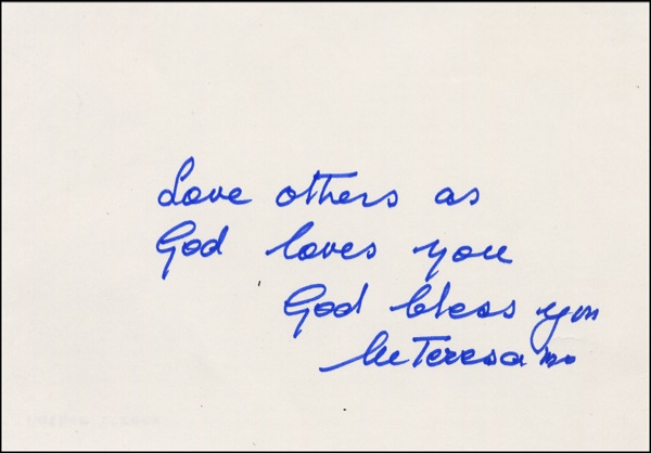 Internationally renowned and controversial Catholic nun and founder of the Missionaries of Charity whose work among the poor of Calcutta was widely reported. She was awarded the Nobel Peace Prize in 1979. She was made an Honorary Citizen of the United States in 1996 (one of only six). She was beatified by Pope John Paul II in October 2003, hence she may be properly called Blessed Teresa by Catholics. AQS on a 6 x 4.25 off-white card. Mother Teresa writes “Love others as God loves you.” Signed at the conclusion “M. Teresa mc.” In fine condition. R&R COA.