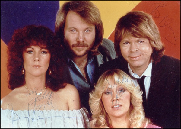 Color glossy 10 x 7 group photo, signed in blue ballpoint by Benny, Bjorn, Agnetha and Frieda. In fine condition. R&R COA.