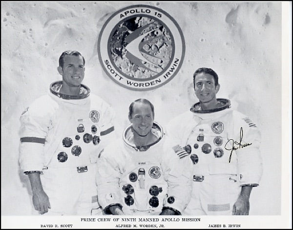 Nice 10 x 8 cardstock photo of the Apollo 15 prime crew, signed in black felt tip, “Jim Irwin.” In fine condition. R&R COA.