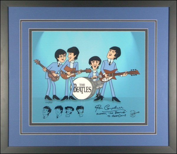 Limited edition hand painted cel, #222/225, featuring the 1960s Saturday morning cartoon Beatles playing their instruments, signed along the bottom in black felt tip “Ron Campbell, Director ‘The Beatles’ TV cartoons,” and adding four very nice facial sketches of John, Paul, George and Ringo. Double matted and framed to an overall size of 25 x 22.5. Item is noted as licensed by Apple Corps. In fine condition. R&R COA. Oversized.