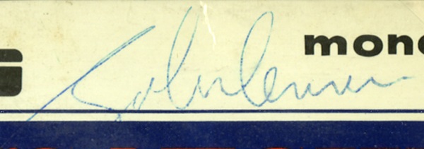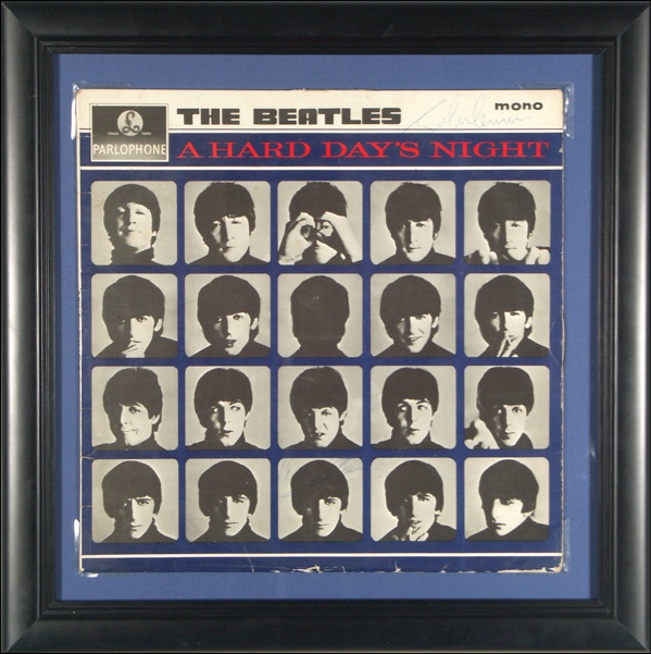 A Hard Day’s Night original UK issue album signed on the front in blue ballpoint, “John Lennon” and “Ringo Starr.” Matted and framed to an overall size of 16.5 x 16.5. Accompanied by a certificate of authenticity from Beatles expert Frank Caiazzo, who dates the signatures from mid 1964. In very good condition, with some light contrast to Starr’s signature, minor skipping to Lennon’s, creasing and some small separations along edges and a bit of light soiling. The record is included. COA Roger Epperson/PSA/DNA, COA from Beatles Memorabilia author Perry Cox and R&R COA.