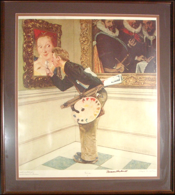 Color 25.5 x 29.5 collotype print entitled The Critic, signed in the lower border in black felt tip. This illustration was selected as the April 16, 1955 cover for the Saturday Evening Post. Image portrays an intent young artist (the model for the young man being Rockwell’s oldest son Jerry) using a magnifying glass to study the locket on the bosom of a beguiling young lady (posed for by Mary, Rockwell’s second wife). Double matted and framed to an overall size of 32.5 x 37. In fine condition, with some light spreading of signature resulting in a slightly fuzzy appearance. R&R COA. Oversized.