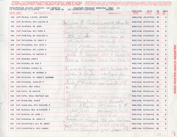 DS, signed “Ronald W. Reagan,” one page, 14.25 x 11, 1980. Page thirteen of the Los Angeles election precinct 9001376A voter registration, listing Ronald Reagan as a Republican, signed in pencil “Ronald W. Reagan,” adding his address “1669 San Onofre Dr.,” on the line next to his signature. Also signed two lines above by his wife “Nancy W. Reagan,” listing the same address, as well as by eighteen other citizens. In fine condition, with torn punch holes to left edge and a small pencil notation to lower left. COA John Reznikoff/PSA/DNA and R&R COA.