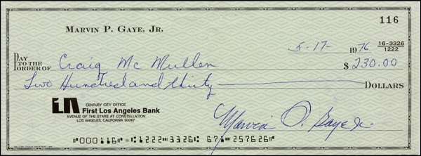 Talented singer/songwriter whose music reflected an uncommon social awareness; he was shot to death by his father in 1984. Personal check, 8.25 x 3, filled out in another hand and signed by Gaye, payable to Craig McMullen for $230.00, May 17, 1976. In fine condition, with two staple holes along top edge and three vertical folds, one through a single letter of last name of signature. R&R COA.