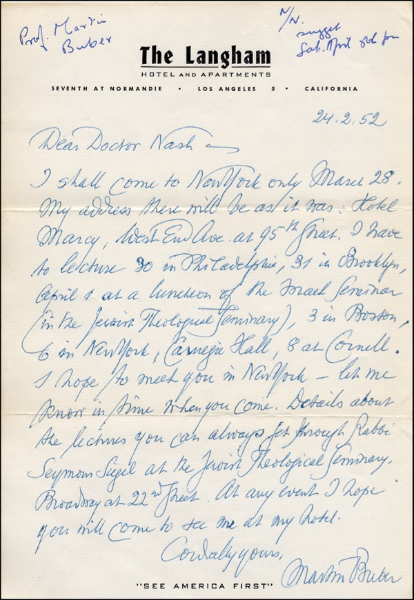 German Jewish philosopher and writer; he evolved philosophy inspired by study of Hasidism, based on encounter of man with nature, man, and God. ALS, one page, 7.25 x 10.5, The Langham Hotel and Apartments letterhead, February 24, 1952. A letter to Dr. Nash. In part: “I shall come to New York only March 28. My address there will be as it was…I have to lecture 30 in Philadelphia, 31 in Brooklyn, April at a luncheon of the Israel Seminar, 3 in Boston…I hope to meet you in New York. Let me know in time when you come. Details about the lectures you can always get through Rabbi Seymour Siegel…At any event I hope you will come to see me at my hotel.” In fine condition, with edge toning, ink notations in another hand in the upper corners. R&R COA.