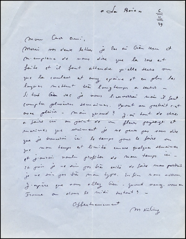 Polish artist who lived and worked in Montparnasse where he was part of the renowned artistic community gathered there at the time. He became close friends with his neighbor, Modigliani, who painted him in 1916 (today at the Musee d'Art Moderns). His style used in painting landscapes is similar to that of Marc Chagall, but, a master at depicting the female body, his surreal nudes and portraits earned him the widest acclaim. ALS in French, signed “M. Kisling,” one page, 8 x 10, June 11, 1949. Translated from the French. In part: “My dear friend, thank you for your letter….the flowers and the sea…I have not profited from my time here am very excited about your portrait…I am not very…Finally, we…I hope that we…when you are in France….” In fine condition, with a horizontal and a vertical fold, bit of edge toning, bit of wear to upper right corner. R&R COA.
