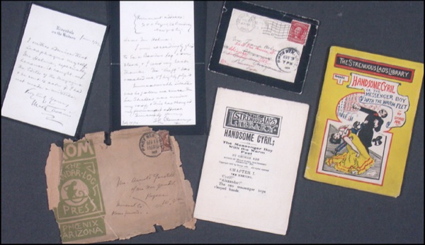 Samuel Clemens archive of 6 pieces including a poignant unpublished letter with content pertaining to the death of his wife Olivia. Archive includes two ALSs written to John Francis "Frank" Holme. Holme was a famous newspaper sketch artist who covered the trials of Adolph Luetgert for the Chicago Daily News. He was also a writer and printer who founded a publishing endeavor called the Bandar Log Press. Clemens and Holme were friends as Clemens was among those who contributed financially to the project. An ALS dated July 29, 1904 to Holme reads, "Dear Mr. Holme: I am exceedingly glad to be a Bandar Log Town stock and I send my best thanks. The "stuff" has reached me and I highly prize it. Immeasurable disaster as befallen me since the La Shelles were under my roof and this has changed my permanent address. Sincerely your, S.L. Clemens." At the top Clemens wrote, "Permanent address: c/o H.H. Rogers, 26 Broadway New York City." Olivia's death had hit Clemens hard. The night of her death, Clemens wrote in his notebook, "At a quarter past 9 this evening she that was the life of my life passed to the relief & the peace of death after as months of unjust & unearned suffering. I first saw her near 37 years ago, & now I have looked upon her face for the last time. Oh, so unexpected!… I was full of remorse for things done & said in these 34 years of married life that hurt Livy’s heart." The H.H. Rogers Clemens refers to is Henry H. Rogers, the Standard Oil magnate, who saved Clemens from financial ruin as well as copyright violations and the two became unlikely friends during the writer’s darkest hours. Clemens also makes mention of the La Shelles. This is reference to playwright Kirke La Shelle who was also Treasurer of the Bandar Log Press. This ALS also comes with the transmittal envelope. The second ALS from Clemens to Holme is dated Jan. 4, 1902 from Riverdale on the Hudson. Clemens moved his family to Riverdale in an effort not to set foot back into their Hartford home since their child had died there. The letter reads, "I rather admire that aesophogus myself, Mr. Holme, especially because it caught our editor of the magazine and he sent to ask if I had made a mistake. Very truly yours, Mark Twain." The reference undoubtedly refers to the spelling of aesophogus that Twain used when he wrote, "The Comedy of Those extraordinary twins" published in 1900. Perhaps Holme made a lighthearted remark about it and Clemens was just responding saying how his editor thought he had made a mistake. Also included in the archive are two copies of the Bandar Log Press. While both appear to be the same edition, one seems to be a more complete version with a color cover. Both contain a story by American humorist, George Ade, titled "Handsome Cyril or the Messenger Boy With the Warm Feet. The books themselves are limited editions. One is a limited edition copy hand numbered 412 of 674. Holme has written in this copy a note to his sister, "Mrs. Nan Gerstell, Merry Christmas from her brother the printer 1903." The book also comes with a transmittal envelope. The books alone are collectors items with one currently selling for $1500 without covers. This archive includes two copies. In very good overall condition. COA John Reznikoff/PSA/DNA and R&R COA.