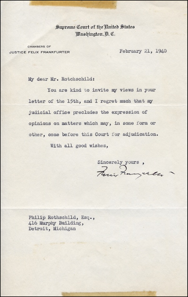 Associate Supreme Court justice, 1939-62, and a founder of the ACLU. TLS, one page, 5.75 x 9, Supreme Court of the United States, Washington, D.C. letterhead, February 21, 1940. A letter to a Mr. Rotchschild in Detroit. In part: “You are kind to invite my views in your letter of the 15th, and I regret much that my judicial office precludes the expression of opinions on matters which may, in some form or another, come before this Court for adjudication.” In fine condition, with adhesive residue to top and bottom borders, bit of edge toning, a couple of areas of faint discoloration. R&R COA.