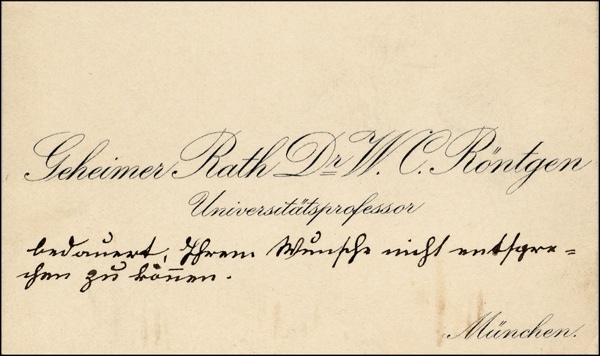 Recipient of the first Nobel prize for physics in 1901 and the discoverer of X-rays. His achievement heralded the age of modern physics and transformed medical practice. Unsigned ANS in German, on one of his personal university calling cards, 4 x 2.5, no date. Unsigned note reads in full, “Regrets not to be able to accept your invitation.” Accompanied by an original unsigned postcard portrait of Roentgen. In fine condition, with a bit of light toning and some scattered silvering to portrait. COA John Reznikoff/PSA/DNA and R&R COA.