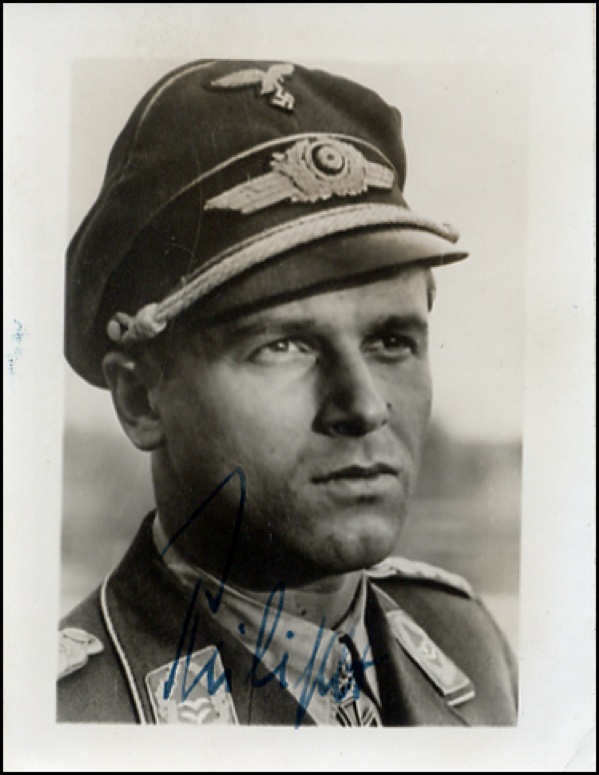 Hauptmann and Luftwaffe ace with 206 victories, shot down and killed on October 8, 1943, while attacking a bomber formation. Vintage glossy 3.5 x 4.75 Hoffmann press photo of Philipp in his uniform, signed in fountain pen, “Philipp.” A few scattered surface marks and some corner tip creases, otherwise fine condition. R&R COA.