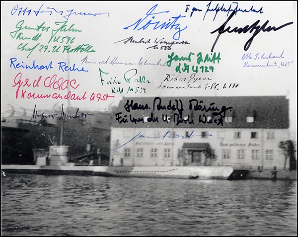 Glossy 10 x 8 photo of a U-Boat moored to a dock, signed in felt tip and ballpoint by sixteen commanders, including: Donitz, Jahn, Kentrat, Kretschmer, Lehmann-Willenbrock, Metzler, Poske, Pulst, Reche, Rosing, Schaar, Schlippenbach, Schuhart, Winter, Witt and Wohlfarth. In fine condition. R&R COA.