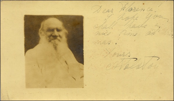 Russian novelist and moral philosopher who wrote the great novels War and Peace and Anna Karenina. He advocated a classless, self-sufficient society that prized love and charity above economics. Practicing his beliefs, the aristocrat renounced his worldly possessions to live virtually penniless among the peasants he loved, and in 1910, seeking to get closer to God, he abandoned his home and family. Leaving home secretly and accompanied only by his physician and a daughter, he died in a remote railway station only a few days later of pneumonia. Vintage matte-finish 5.75 x 3.25 photo of Tolstoy looking almost beatific, signed and inscribed in fountain pen “Dear Florence! I hope you shall have a nice time at Christmas! Yours, Tolstoy.” Actual image size is 1.75 x 2.5. In fine condition, with light silvering to the darker areas of the photo, scattered small areas of trivial soiling, the most minor of edge wear. COA John Reznikoff/PSA/DNA and R&R COA.