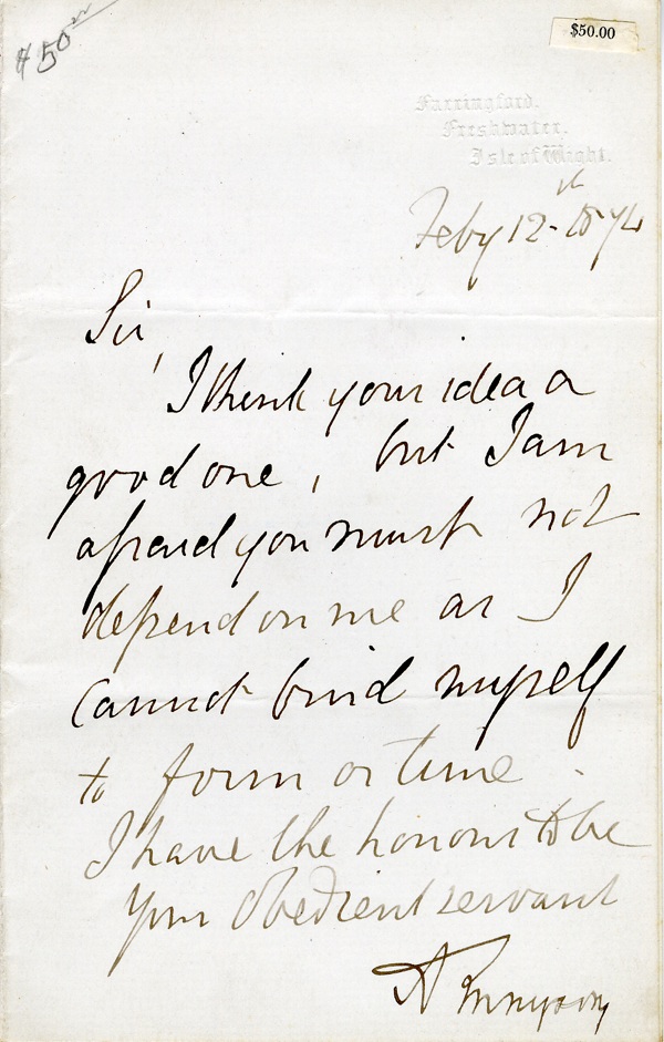 English poet. The most famous poet of the Victorian age, he was a profound spokesman for the ideas and values of his times. ALS signed “A. Tennyson,” one page, 4.5 x 7, Harringford letterhead, February 12, 1876. Letter to an unidentified gentleman. In full, “I think your idea a good one, but I am afraid you must not depend on me as I cannot find myself to form on time.” Two horizontal folds and a small notation and label to top corners, otherwise fine condition. R&R COA.