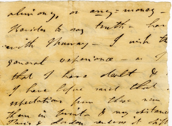 A poet and satirist, Byron was born into nobility and inherited his title. He went to college and served in the House of Lords before attempting to finish his first poetic work, Hours of Idleness, which was poorly received. He lived with the Shelleys for a time and fought to liberate Greece from Turkey. His heroes are today remembered as melancholy, defiant young men and he is considered one of the finest English poets. Partial ALS signed “Byron,” one page both sides, 4.25 x 3, no date. A fragment of an ALS, with left edge trimmed off, containing over sixty complete words and several partial words, boldly signed at the conclusion “Byron.” In very good condition, with bisecting vertical fold, light staining to reverse, and light show through from writing on reverse. COA John Reznikoff/PSA/DNA and R&R COA.