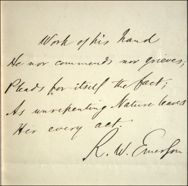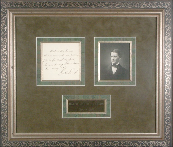 Author and philosopher active in the transcendental movement and Brook Farm experiment. Rare AQS from one of his essays on a 5 x 7 off-white sheet. In full, “Work of his hand, He nor commends nor grieves, Pleases for itself the fact; As unrepenting nature leaves, Her every act.” Signed at the conclusion, “R. W. Emerson.” Beautifully double suede matted and framed with a portrait of Emerson and a name plaque, to an overall size of 24 x 21.5. In fine condition. COA John Reznikoff/PSA/DNA and R&R COA. Oversized.