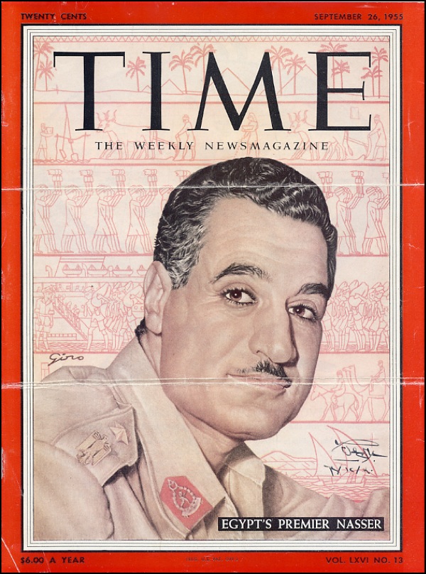 Egyptian army officer and politician; President of the United Arab Republic. Magazine cover from the September 26, 1955 issue of Time, signed in black ink on the front cover in Arabic. Edges a bit rough and two horizontal mailing folds, otherwise fine condition. R&R COA.