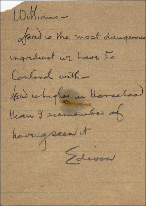 A letter to C.S. Williams, the head of Edison’s Motion Picture Division. ALS signed “Edison,” one page, 5 x 7, lightly lined off-white notebook paper, no date. In full: “Williams - Lead is the most dangerous ingredient we have to contend with - - Lead is higher in Horsehead [?] than I remember of having seen it.” A clear indication of Edison’s learnedness as he was aware of the dangers of lead long before it became the public concern it has become - - Greek physicians gave clinical descriptions of lead poisoning 100 B.C. and in the U.S. in 1887, medical authorities diagnosed lead poisoning in children. Perhaps the “horsehead” here is a reference to horsehead philodendron, a highly toxic plant. In very good condition, with a stain at center with what appear to be two rusted staple holes, two folds, scattered faint surface impressions, a chip to the upper left. COA John Reznikoff/University Archives and R&R COA.