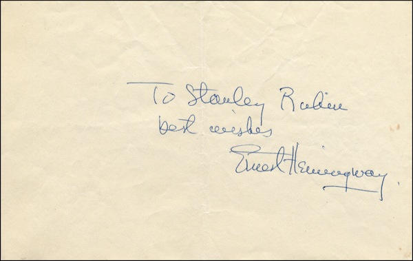 Ballpoint signature and inscription, “To Stanley Rubin, best wishes, Ernest Hemingway,” on an off-white 6.5 x 4.25 sheet. Accompanied by a letter of provenance from Rubin, describing how the signature was obtained, “My mother was on a cruise and was stopping in Havana, Cuba. She noticed a man standing in the main square and thought he looked like an American. She slowly approached him and said, ‘Pardon me, but are you Ernest Hemingway?’ He replied yes.” In fine condition, with a bisecting vertical fold and a couple of trivial wrinkles. COA John Reznikoff/PSA/DNA and R&R COA.