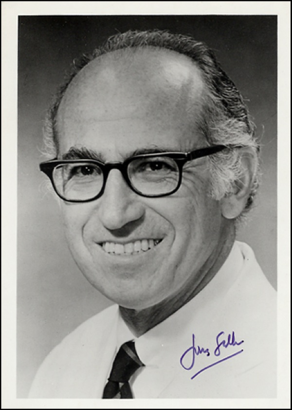Co-discoverer of the polio vaccine. Glossy 5 x 7 close-up portrait, signed in purple felt tip. In fine condition, with scattered faint surface impressions. R&R COA.