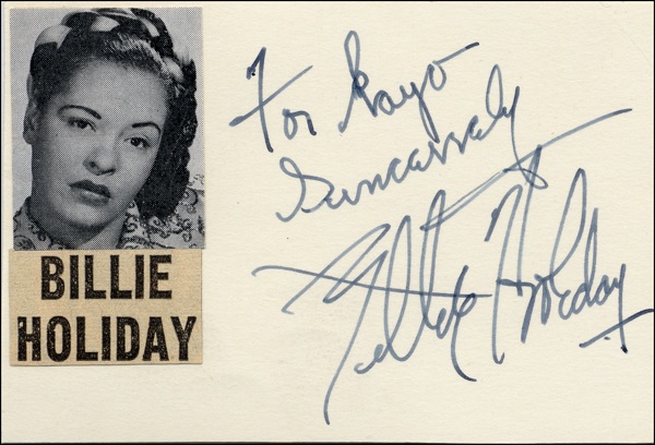 Jazz singer famous for her highly individual style; she died of a heroin overdose in 1959. Fountain pen signature and inscription, “For Kayo, Sincerely, Billie Holiday,” on an off-white 4.25 x 3 card, with a small photo of Holiday affixed to the left edge. In fine condition. R&R COA.