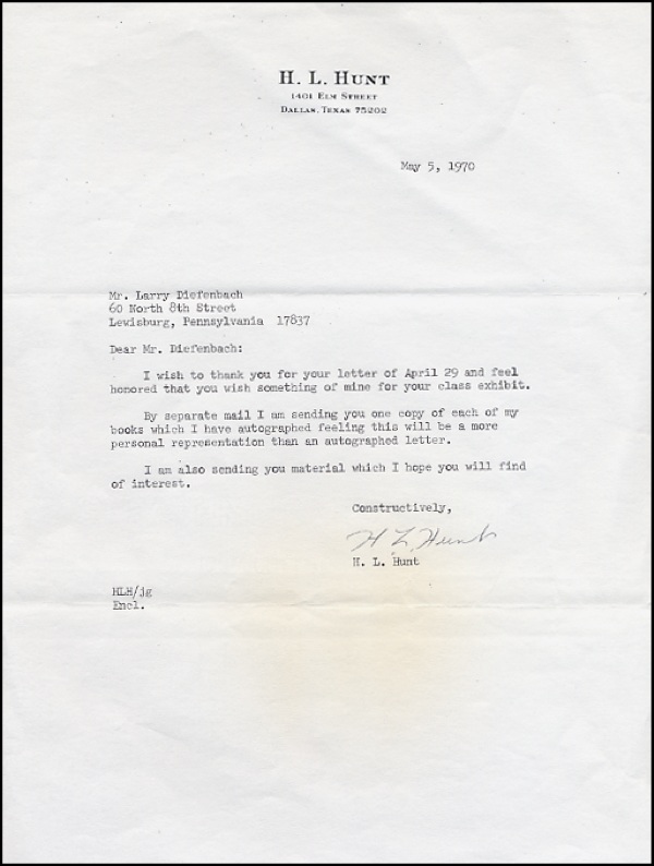 American oil tycoon. TLS, one page, 8.5 x 11, personal letterhead, May 5, 1970. In part: “By separate mail I am sending you one copy of each of my books which I have autographed feeling this will be a more personal representation than an autographed letter. I am also sending you material which I hope you will find of interest.” In fine condition, with scattered faint toning and creasing. R&R COA.