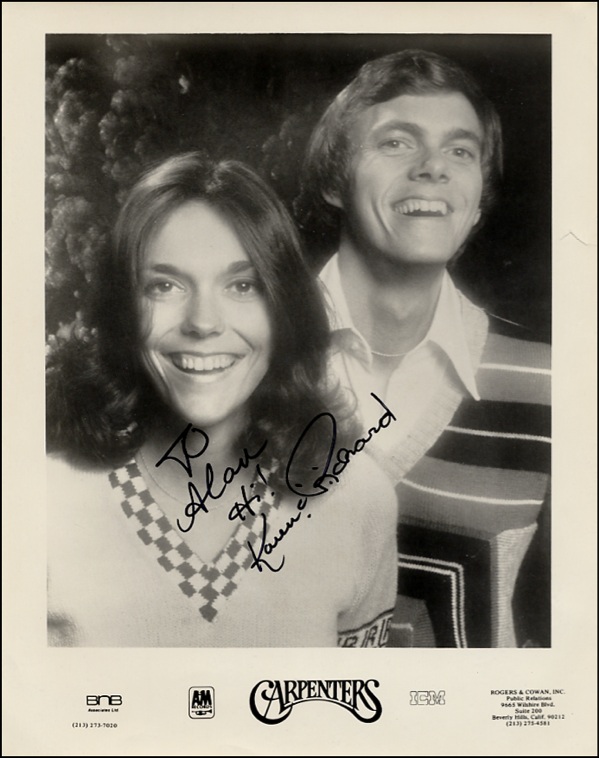 Glossy 8 x 10 A & M Records promotional photo, signed and inscribed in black felt tip “To Alan, Hi! Karen” and “& Richard.” In fine condition. R&R COA.