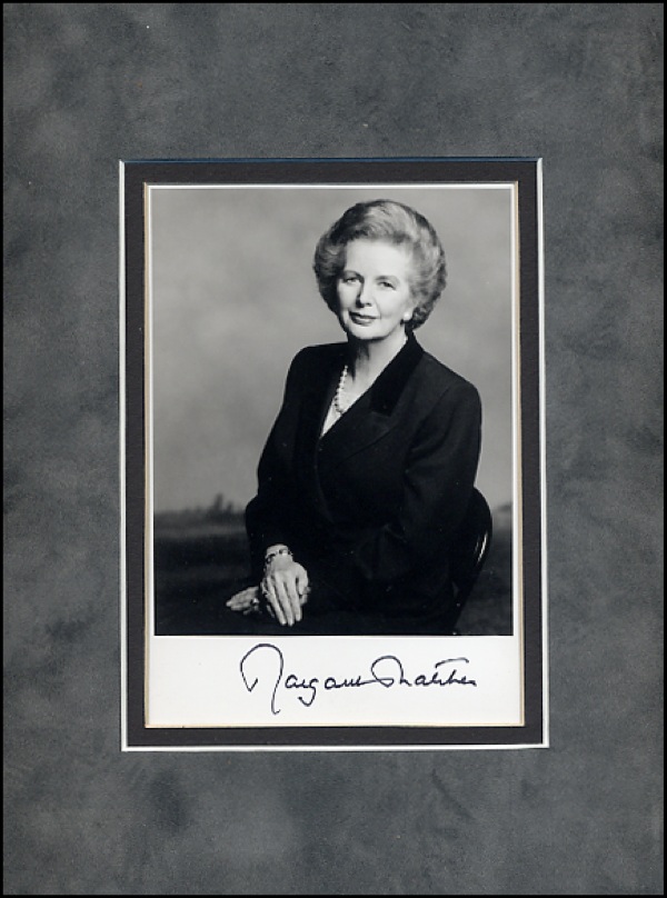 Prime Minister of Great Britain 1979 to 1990. Satin-finish 5 x 7 portrait, signed in black felt tip in the border beneath the image, double matted to an overall size of 9.25 x 11.25. In fine condition, with minor scuffing to the suede portion of the matte. R&R COA.