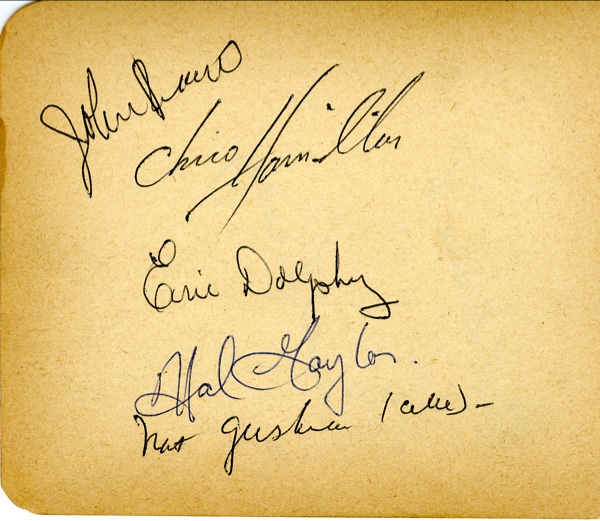 Regarded as a true original with his own distinctive styles on alto, flute and bass clarinet, Dolphy died suddenly at the age of 36 from a diabetic coma. Vintage ink signature on an off-white 5.25 x 4.5 album page. Signing above Dolphy are Chico Hamilton (jazz drummer), John Pisano (jazz guitarist) and beneath Dolphy’s signature are those of Hal Taylor and Nat Gershman (jazz cellist), In very good condition, with toning working in from edges, giving Dolphy’s signature the appearance of being spotlighted (!), faint showthrough from Israel Crosby’s (jazz bassist) signature on reverse. COA Roger Epperson/PSA/DNA and R&R COA.