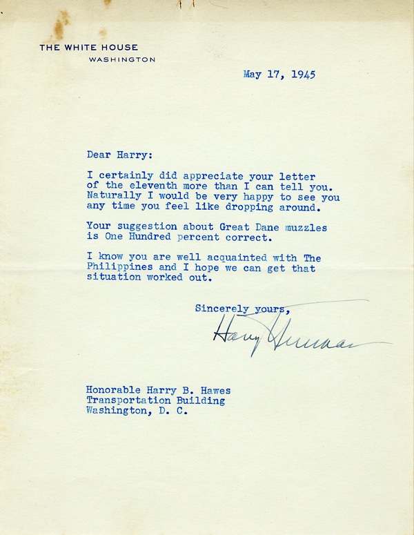 TLS as president, one page, 7 x 9, White House letterhead, May 17, 1945. Letter to Transportation employee Harry Hawes. In part, “I certainly did appreciate your letter…I would be very happy to see you any time you feel like dropping around…I know you are well acquainted with The Philippines and I hope we can get that situation worked out.” Accompanied by the original mailing envelope. In fine condition, with light toning and a rusty paperclip mark along top edge. R&R COA.