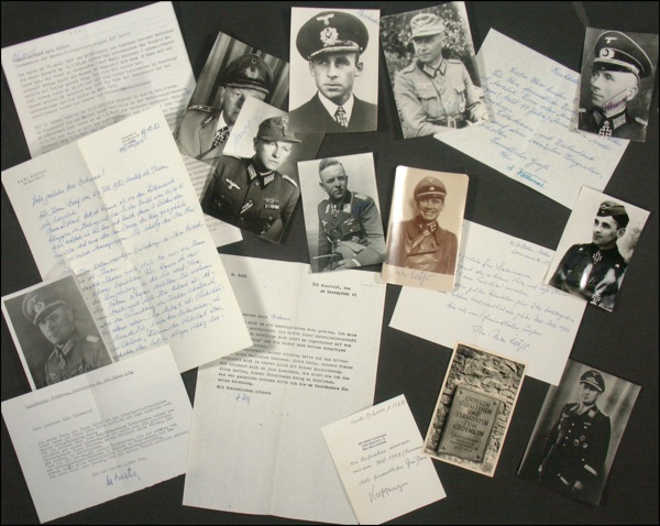 Impressive group lot of of approximately forty letters (many in German) and signed photos from various recipients of the Knight’s Cross. Signers include: Karl Herzog, Adolf Weitkunat, Grambal Franz, Hans-Martin Fritsche, Heinrich Ruhl, Franz Weller, Ulrich Stahl, Hans Spielmann, Heinz Brirbarker, Heinz Hofer, Hermann Witt, Jurgen Steinkeller, Max Hansen, Arthur Juttner, Johann Condne, Gerhard Hein, Alfred Eick and several others. In fine condition. R&R COA.