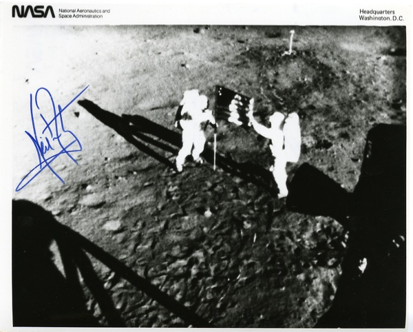 Historic glossy 10 x 8 NASA photo of Armstrong and Buzz Aldrin unveiling the American flag on the lunar surface, signed in blue felt tip by Armstrong. In fine condition. COA Ken Havekotte and R&R COA.