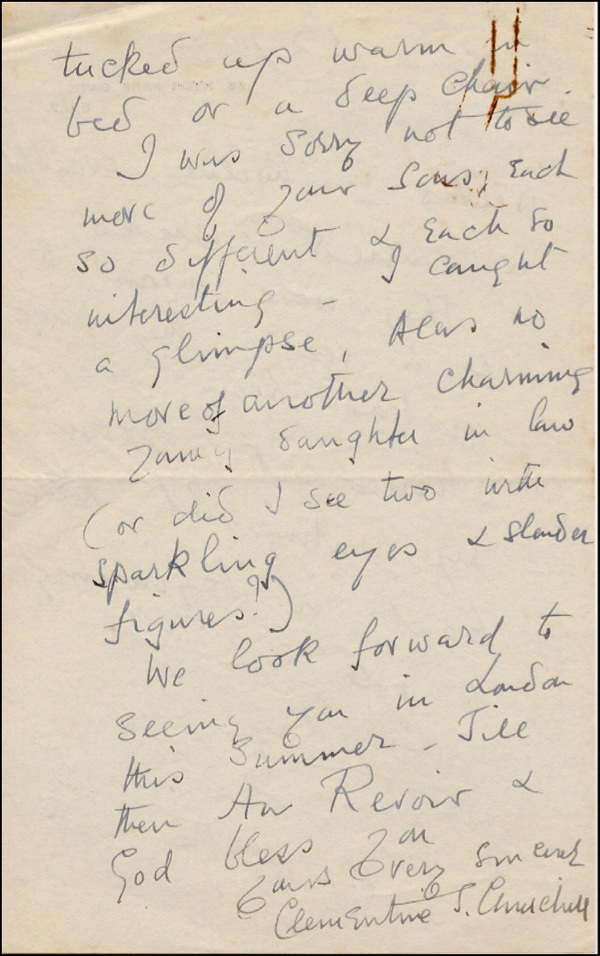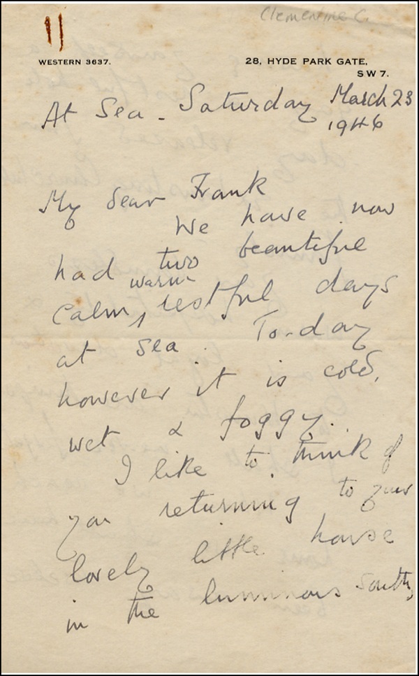 After her marriage, during World War I, Lady Churchill organized canteens for munitions workers. During World War II she was Chairman of the Red Cross Aid to Russia Fund, the President of the Young Women's Christian Association War Time Appeal and the Chairman of Fulmer Chase Maternity Hospital for Wives of Junior Officers. The Clementine Churchill Hospital in Harrow, Middlesex, is named after her. In 1965 Lady Churchill was created a life peer as Baroness Spencer-Churchill. ALS, two pages both sides, 5 x 8, personal letterhead, March 23, 1946. in part: “My dear Frank, We have now had two beautiful calm warm restful days at sea. Today however it is cold wet and foggy. I like to think of you returning to your lovely little house in the …and having yourself a gay and restful holiday, released from the exhausting Churchill family…Your hospitality and...devotion to Winston are times I shall never forget….Excuse my writing but the boat is beginning to roll…We have had a bit of rough weather but I don’t mind it tucked up on a deep chair…We look forward to seeing you in London this summer….” In fine condition, with expected age toning, rusted paper clip impression to upper left corners. R&R COA.