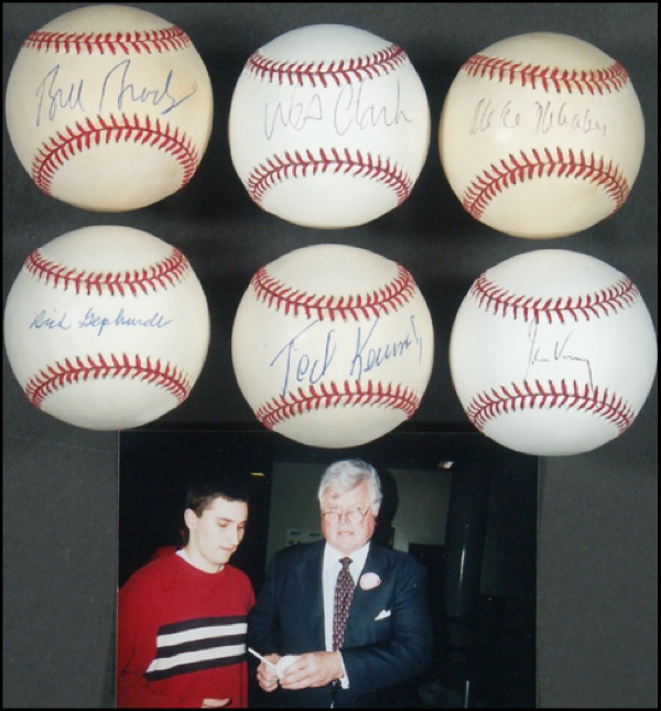 Lot of six baseballs, each signed on the sweet spot by the respective politician in ballpoint. Signers are: Mike Dukakis, Ted Kennedy, John Kerry, Dick Gephardt, Bill Bradley, and Wesley Clark. Accompanied by a color photo of Kennedy signing a ball. In overall fine condition. R&R COA.
