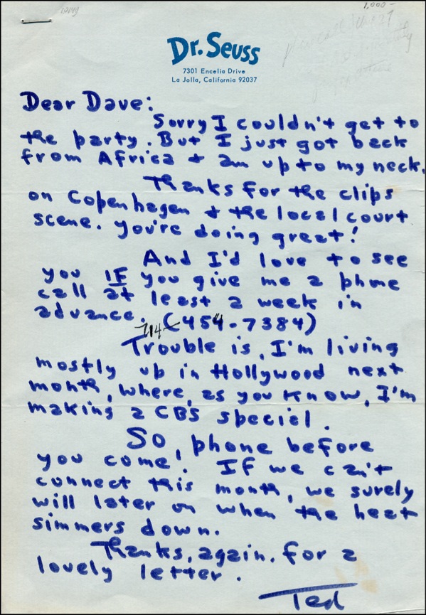 ALS signed “Ted,” one page, 7.25 x 10.5, Dr. Seuss letterhead, no date. Letter to a friend. In part, “Sorry I couldn’t get to the party. But I just got back from Africa & am up to my neck. Thanks for the clips on Copenhagen & the local court scene. You're doing great! And I'd love to see you IF you give me a phone call at least 2 week[s] in advance…Trouble is, I'm living mostly up in Hollywood next month, where, as you know, I'm making a CBS special. So, phone before you come! If we can't connect this month, we surely will later on when the heat simmers down.” Accompanied by the original mailing envelope, postmarked November 19, 1970 and was written during the making of the animated version of Horton Hears A Who! for CBS. In fine condition, with envelope stapled to letter, pencil notations to top edges and a couple spots of light toning. COA PSA/DNA and R&R COA.