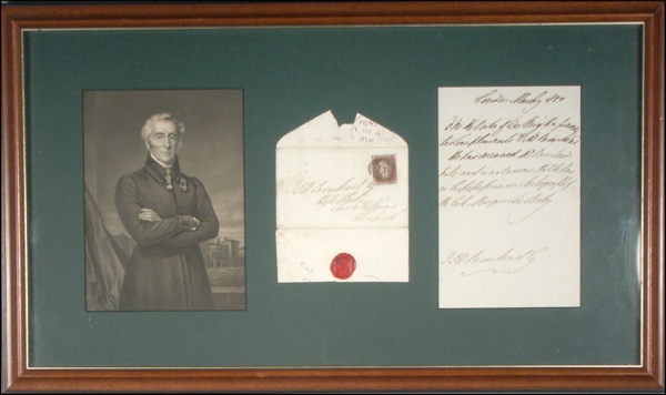 Born Arthur Wellesley, Wellington was responsible for Napoleon’s crushing defeat at Waterloo. ALS, one page, 4.5 x 7, March 9, 1850. Third person letter to a gentleman. In part, “The Duke of Wellington…has received W. Monkhead’s note and is not aware that he has…an autograph of the late Marquis Wellesley.” Matted and framed with the original mailing envelope, addressed in another hand and an engraved portrait of Wellington, to an overall size of 21 x 12.5. In fine condition, with expected folds and light soiling to the envelope. R&R COA.
