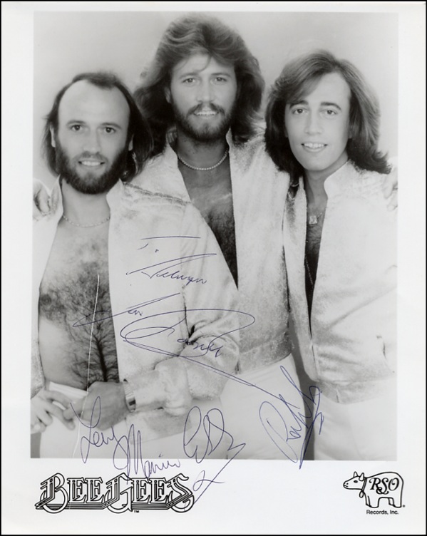 Glossy 8 x 10 RSO promotional photo, signed in black ballpoint by Maurice and Barry Gibb, who adds a short inscription and in blue ballpoint by Robin Gibb. In fine condition, with small line to lower left inherent to the photo. COA Roger Epperson/PSA/DNA and R&R COA.