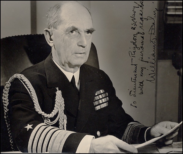 Admiral and Roosevelt’s Chief of Staff. Vintage official Navy glossy 8.25 x 7 photo, signed and inscribed vertically beside his image in fountain pen “To Lieutenant Ridgon, U.S. Navy, with my personal regards, William D. Leahy.” In fine condition, with scattered faint surface impressions, a couple of minor creases, neatly trimmed edges. R&R COA.
