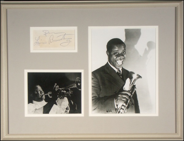 Ballpoint signature, “From Louis Armstrong,” on an off-white album page. Double matted and framed with two great photos of Armstrong, to an overall size of 18.75 x 14. A light block of toning over portions of first and last names, otherwise fine condition. R&R COA.