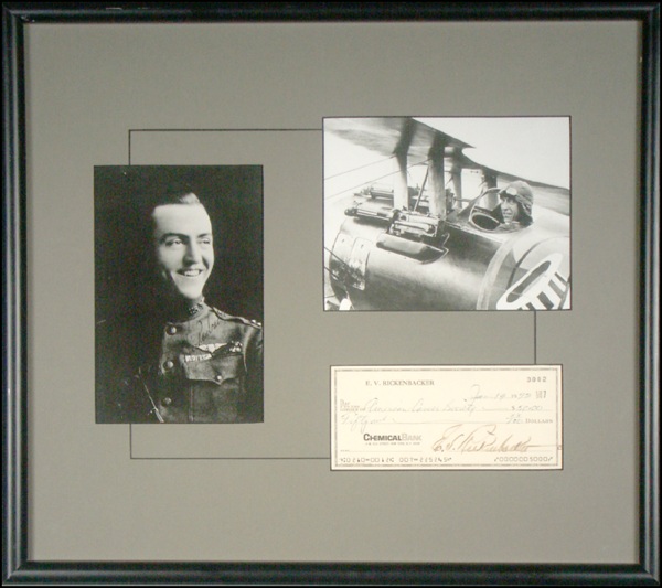 Personal check, 5.75 x 2.75, filled out in another hand and signed by Rickenbacker, payable to the American Cancer Society for $50.00, January 19, 1972. Matted and framed with two photos of a young Rickenbacker, one bearing a facsimile signature, to an overall size of 17 x 15. In fine condition, with light paperclip impression to top edge. R&R COA.