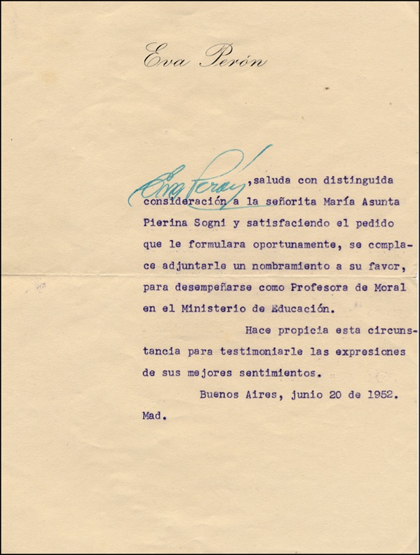 Charismatic and highly ambitious wife of Argentine president Juan Peron; more recently the subject of the musical Evita. DS, one page, 6.75 x 8.75 personal stationery, Buenos Aires letterhead, June 20, 1952. Untranslated document regarding Peron’s appointing Miss Maria Pierina Sogni to the position of “Moral Professor” at the Ministry of Education. In fine condition, with scattered faint toning, a couple of small areas of trivial soiling. R&R COA.