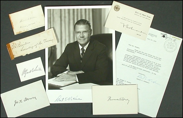 Lot of seven signed cards, photos, and TLS, ranging in size from 3 x 2 to 8 x 10, each signed by the respective politician. Signers are Samuel Tilden, Alfred Smith, Robert McNamara [2], Fiorello LaGuardia, John Garner, Benjamin Bristow and Thomas Dewey. In overall very good condition. R&R COA.
