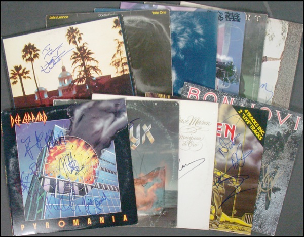 Lot of eleven album covers: Mariposa de Oro, signed by Dave Mason; Everybody Knows This Is Nowhere, signed by Neil Young; Equinox, signed by three members of Styx; A Night on the Town, signed by Rod Stewart; All Shook Up, signed by four members of Cheap Trick; Into the Music, signed by Van Morrison; Double Fantasy, signed by Yoko Ono; Hotel California, signed by Joe Walsh; Slippery When Wet, signed by four members of Bon Jovi; Pyromania, signed by six members of Def Leppard; and Iron Maiden, signed by six members. The Def Leppard, Dave Mason, and Styx records are not included, the others are. In overall very good condition, with moderate age wear to some. COA Roger Epperson/PSA/DNA and R&R COA.